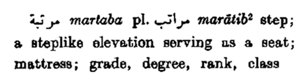 مرتبة martaba pl. مراتب marātib2 step; a steplike elevation serving as a seat; mattress; grade; degree; rank; class