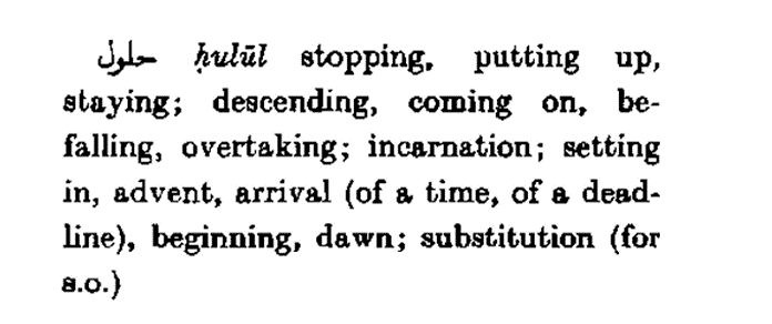 حلول ḥulūl stopping, putting up, staying; descending, coming on, befalling, overtaking; incarnation; setting in, advent, arrival (of a time, of a deadline), beginning, dawn; substitution (for s.o.)