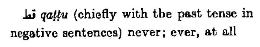 قط qaṭṭu (chiefly with the past tense in negative sentences) never; ever, at all