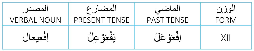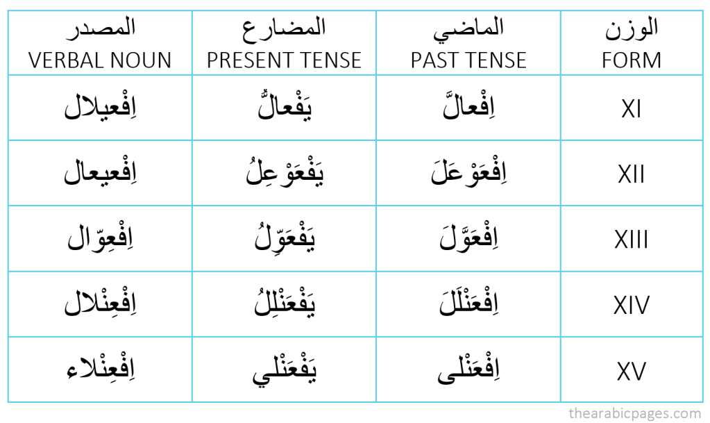 So now we know (or are at least familiar with) the fifteen Arabic verb forms! What examples of form XI-XV verbs do you know?