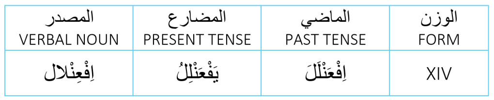 about the pattern: like form XIV, this form has an added ن after the second root letter—it also has an added ى (past tense), ي (present tense), or اء (in the مصدر)