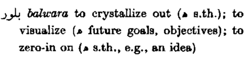بلور balwara to crystallize out (هـ s.th.); to visualize ( هـ future goals, objectives); to zero-in on ( هـ s.th., e.g., an idea)