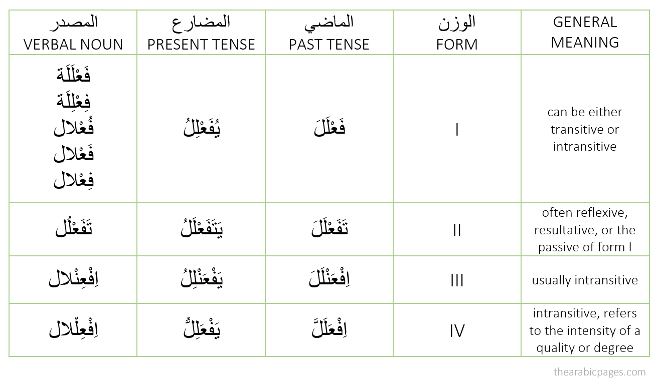 First off, here’s a reminder of the quadriliteral verb forms in Arabic, with the letters ف-ع-ل-ل representing the four root letters: