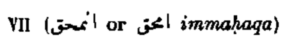 The last example is that of complete assimilation, which is what’s going on with اِمَّحَقَ. It occurs because the ن of the form VII pattern (اِنفَعَلَ) assimilates into the first root letter, م—giving us a verb with a shadda on the first root letter.