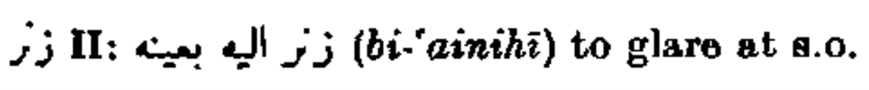 زنر II: زنر إليه بعينه (bi-‘ainihī) to glare at s.o.