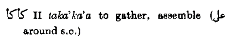 كأكأ II taka’ka’a to gather, assemble (على around s.o.)