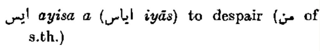 Now, not only is this verb interesting phonetically—something about أَيِسَ / يَأيَسُ sounds quite cool, in my opinion, I think it’s the ء-followed-by-ي sequence—but my immediate thought was: word twin!