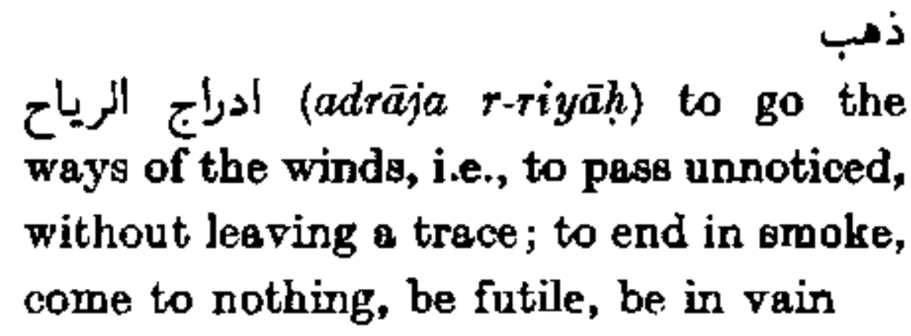 ذهب أدراج الرياح (adrāja r-riyāḥ) to go the ways of the winds, i.e., to pass unnoticed, without leaving a trace; to end in smoke, come to nothing, be futile, be in vain