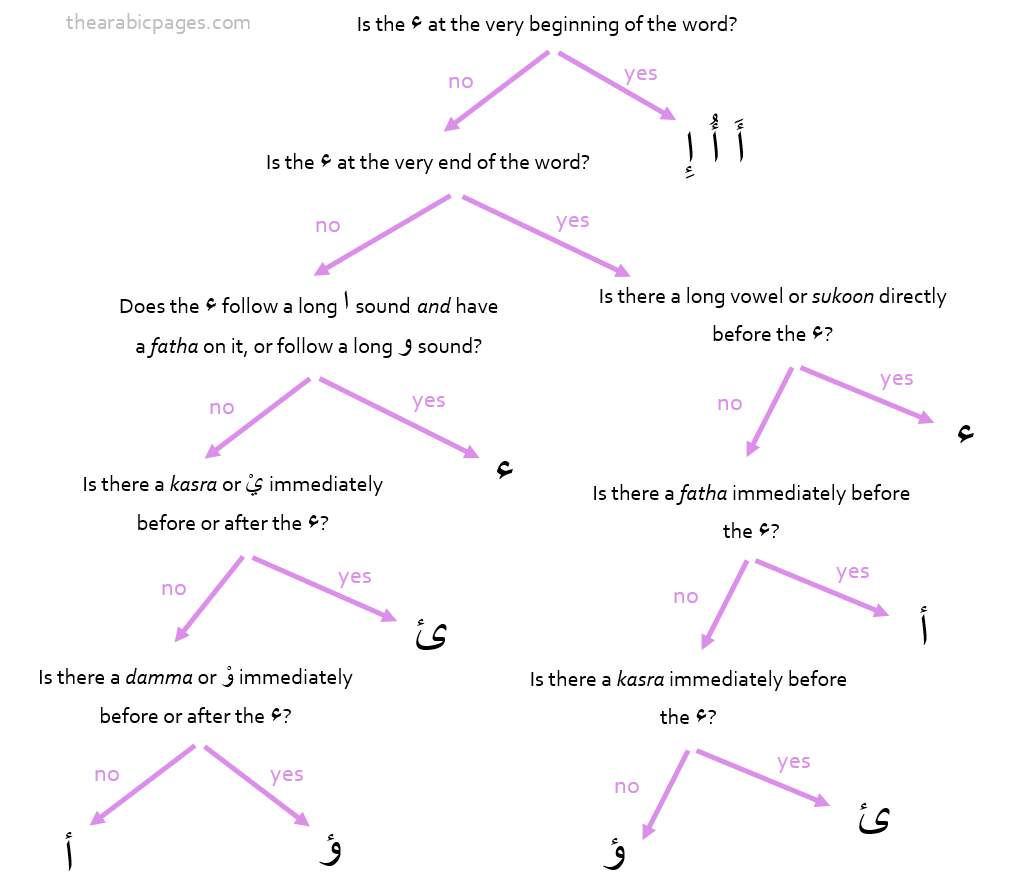 Another point to note is that when we add suffixes to words ending in hamza, the hamza is then no longer in the word-final position, and we have to head back to the flowchart.