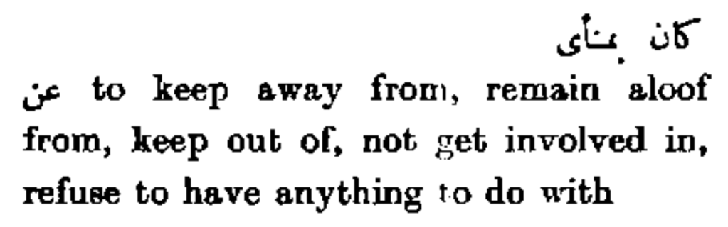 كان بمنأى عن to keep away from, remain aloof from, keep out of, not get involved in, refuse to have anything to do with