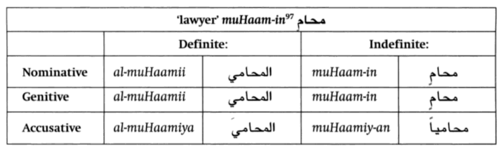 When defective active participles are feminine though, we keep the ي and add the ة—then it’s business (i.e. case endings) as usual. So for a female lawyer, we’d see مُحامية (note that there’s no shadda on the ي—this isn’t a nisba adjective).