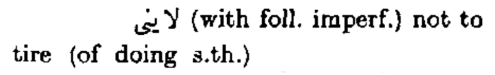 لا يني (with foll. imperf.) not to tire (of doing s.th.)
