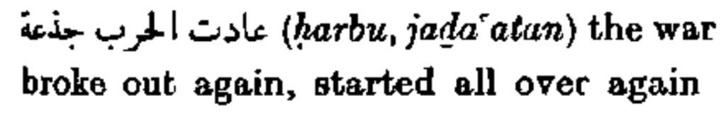 عادت الحرب جذعة (ḥarbu, jaḏa’atan) the war broke out again, started all over again