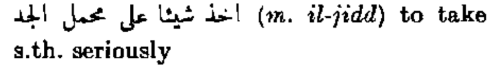 أخذ شيئا على محمل الجد (m. il-jidd) to take s.th. seriously