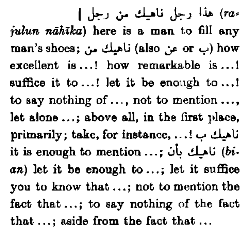 We also see within the examples above that ناهيك من/عن can be translated as “let alone”, making it a synonym of بَلهَ which we explored in Wehr Wednesdays #31.