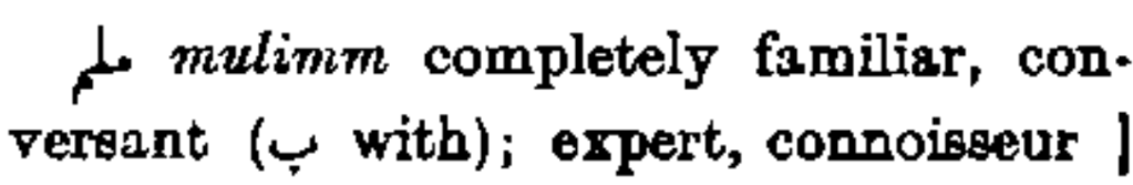 ملم mulimm completely familiar, conversant (ب with); expert, connoisseur