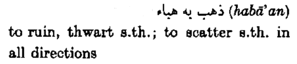 ذهب به هباء (habā’an) to ruin, thwart s.th.; to scatter s.th. in all directions