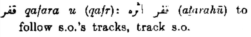 قفر qafara u (qafr): قفر أثره (aṯarahū) to follow s.o.’s tracks, track s.o.