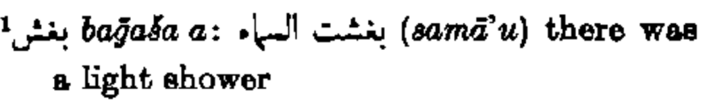 بغش baḡaša a: بغشت السماء (samā‘u) there was a light shower
