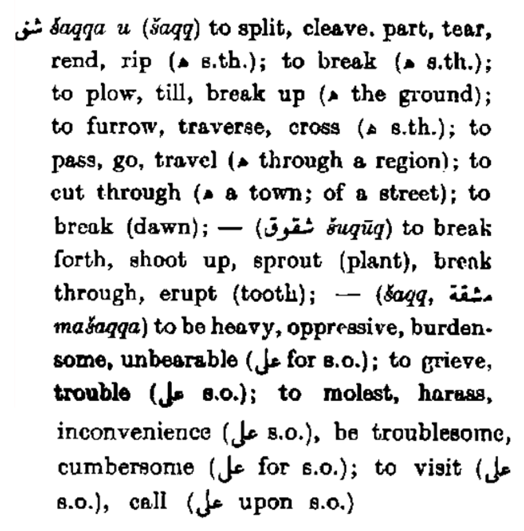 But what was I to do with all those intriguing collocations of the form I geminate verb شَقَّ? I couldn’t choose just one for a Wehr Wednesdays post…