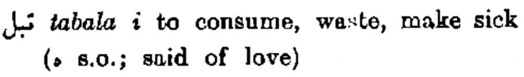 تبل tabala i to consume, waste, make sick (ه s.o.; said of love)