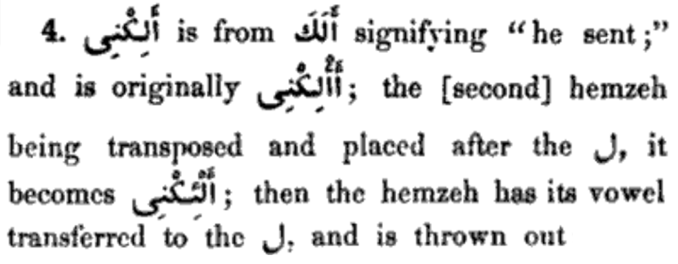 …and this is what gave us the root ل-ء-ك that we found in both dictionaries. But Lane’s Lexicon goes on:
