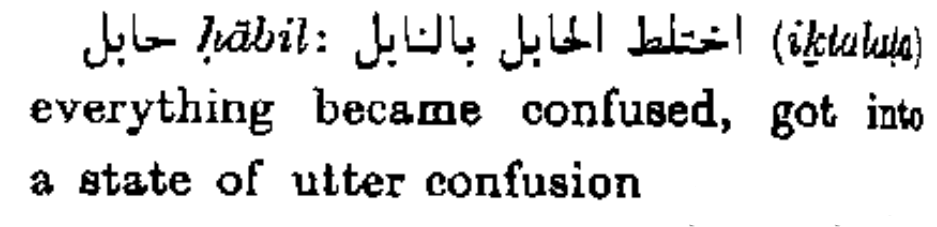 حابل ḥābil: اختلط الحابل بالنابل (iḵtalaṭa) everything became confused, got into a state of utter confusion