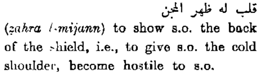 قلب له ظهر المجن (ẓahra l-mijann) to show s.o. the back of the shield, i.e., to give s.o. the cold shoulder, become hostile to s.o.