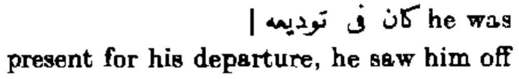 Example: “كانَتْ في تَوْديعِ اِبنِها وَهُوَ يُغادِرُ البَلَدَ لِأَوَّلِ مَرّة”