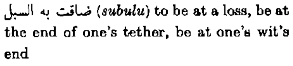 ضاقت به السبل (subulu) to be at a loss, be at the end of one’s tether, be at one’s wit’s end