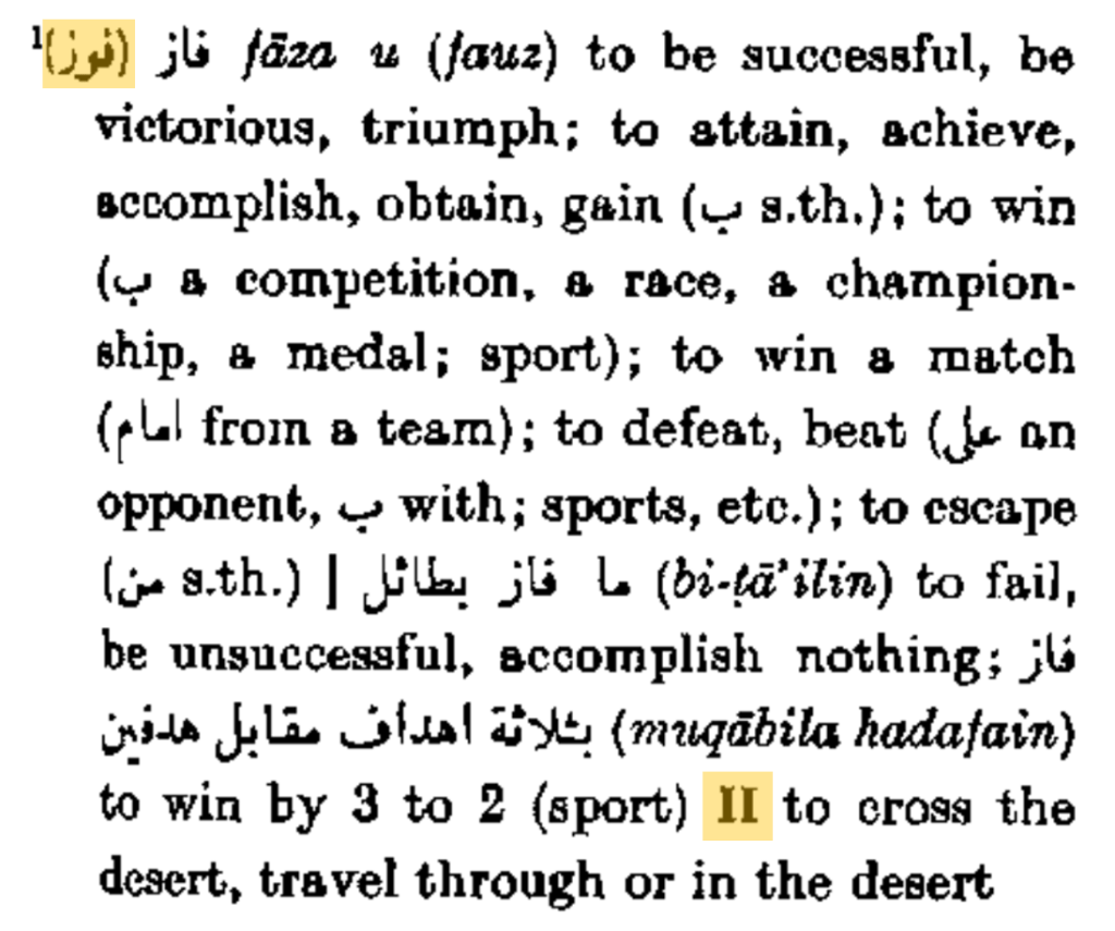 In the midst of all these definitions, the Lexicon refers us back to the verbs from the root. We find that the form II فَوَّزَ / يُفَوِّزُ doesn’t just mean “to travel through a desert” but also “to die”.