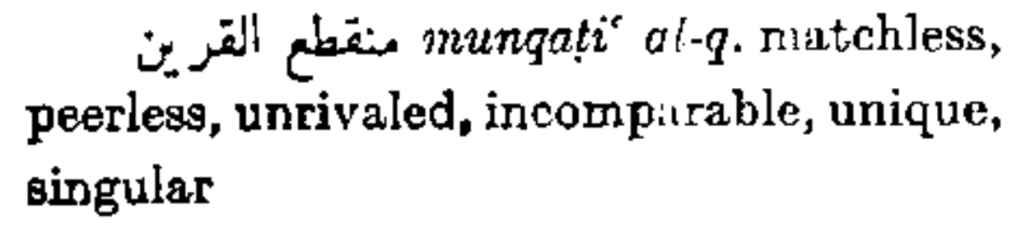 منقطع القرين munqaṭi’ al-q. matchless, peerless, unrivaled, incomparable, unique, singular