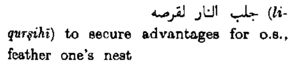 جلب النار لقرصه (li-qurṣihī) to secure advantages for o.s., feather one’s nest