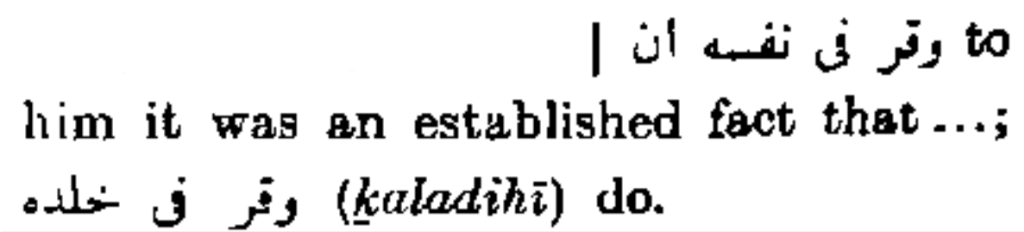 وقر في نفسه أن to him it was an established fact that…; وقر في خلده (ḵaladihī) do.