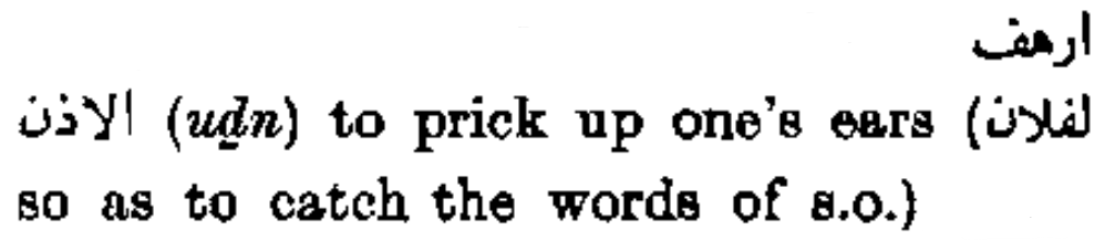 أرهف الأذن (uḏn) to prick up one’s ears (لفلان so as to catch the words of s.o.)