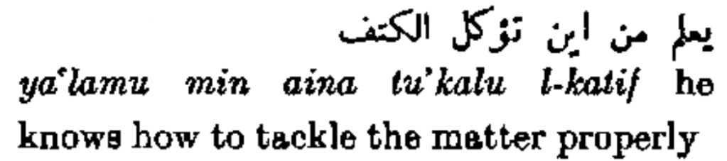 يعلم من أين تؤكل الكتف ya’lamu min aina tu’kalu l-katif he knows how to tackle the matter properly