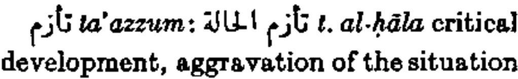 تأزم ta’azzum: تأزم الحالة t. al-ḥāla critical development, aggravation of the situation