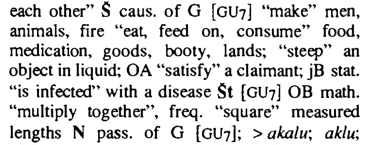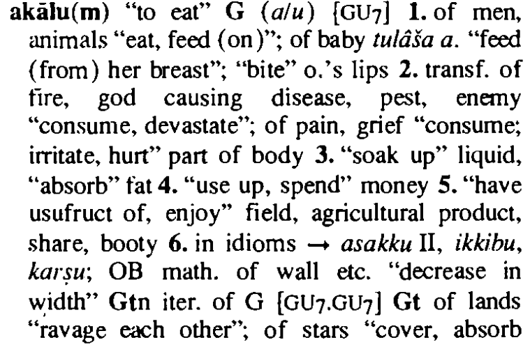 Onto the Akkadian root ‘-k-l, starting with the verbs: