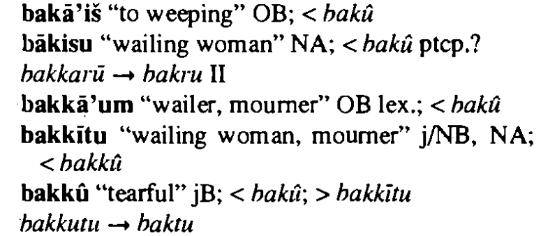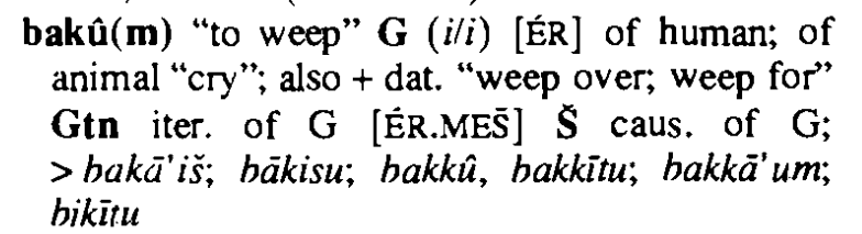 And the Akkadian root b-k-‘ holds the same core meaning: