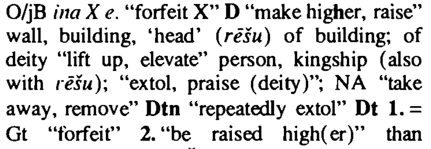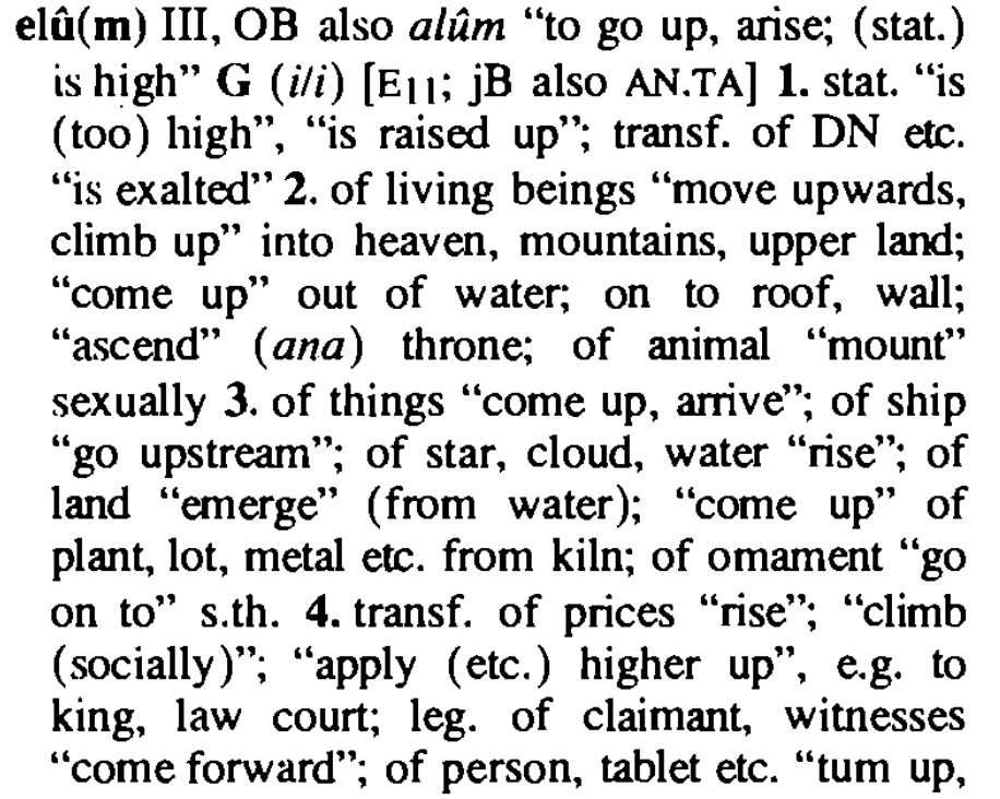 The verb forms and nouns from the Akkadian root are also about elevation and ascension. The G-stem verb (above) corresponds to the Arabic form I verb (i.e. stative or intransitive) while the D-stem (below) corresponds to the Arabic form II (i.e. transitive and causative).